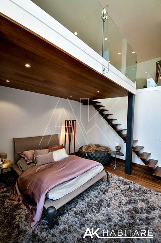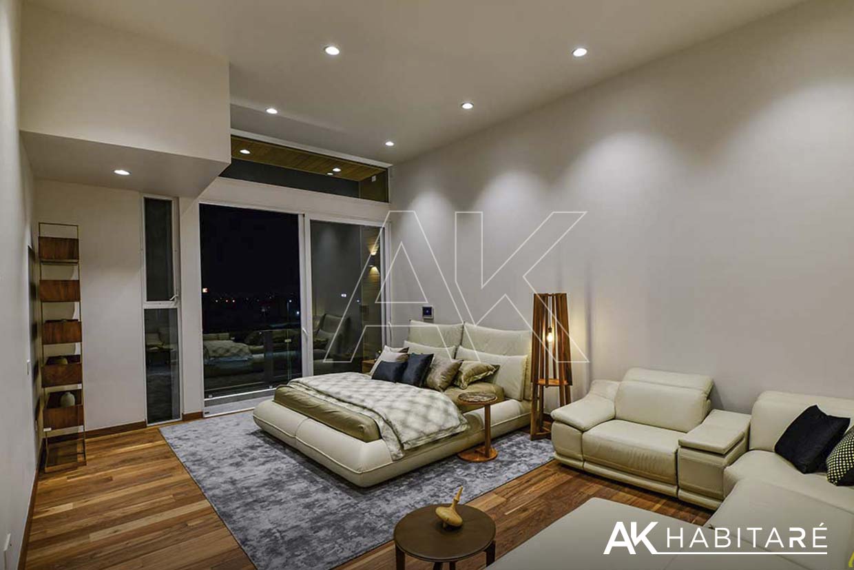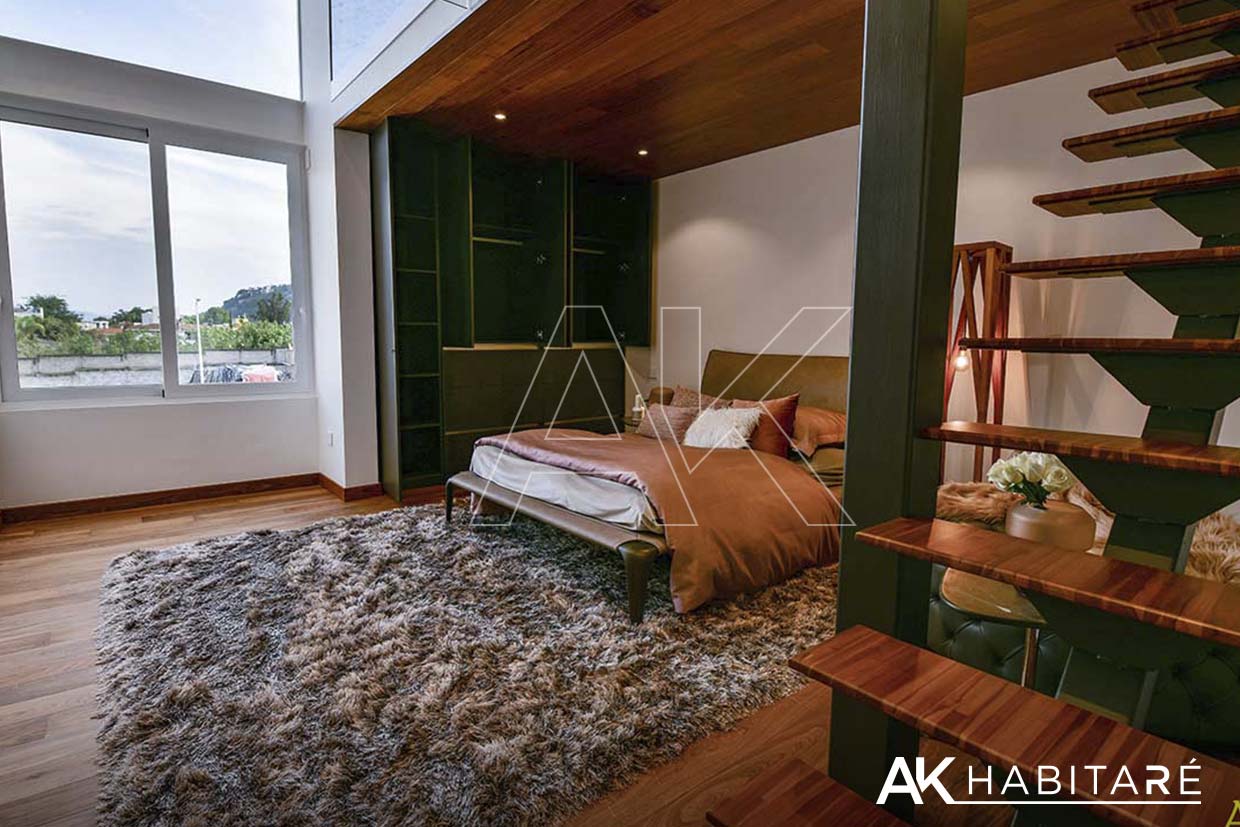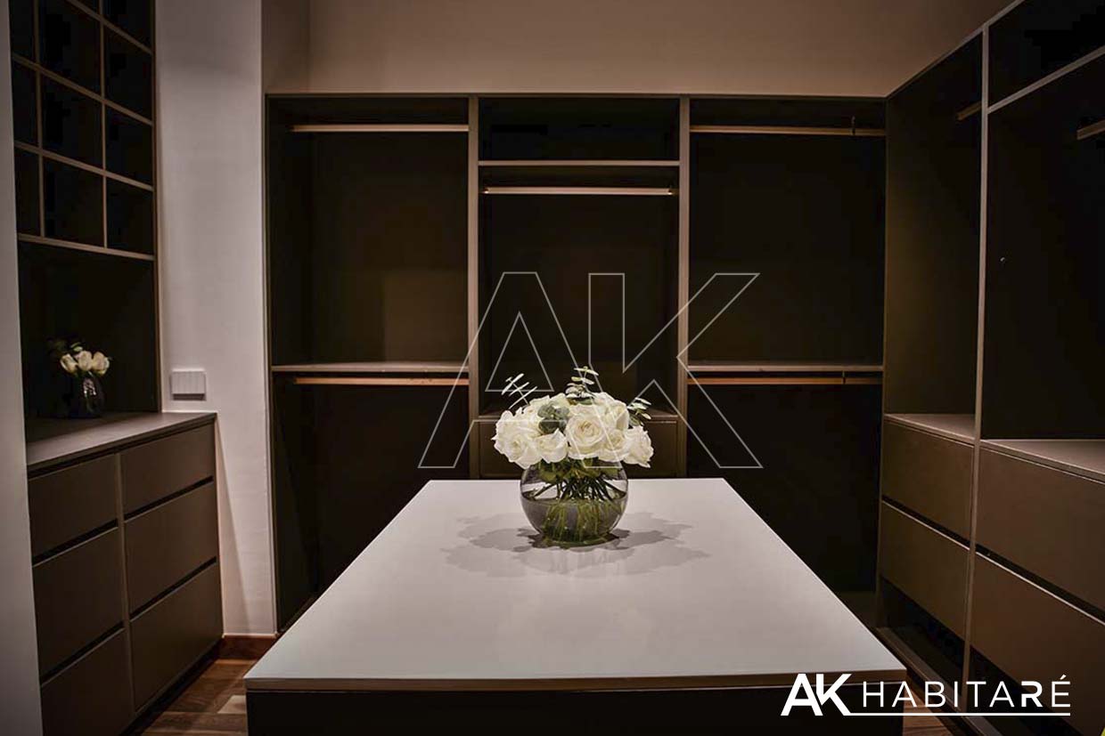 Closets y vestidores fabricados en MDP de última generación cortado y canteado con láser. En planta alta, piso de madera natural de nogal de la más alta calidad.
