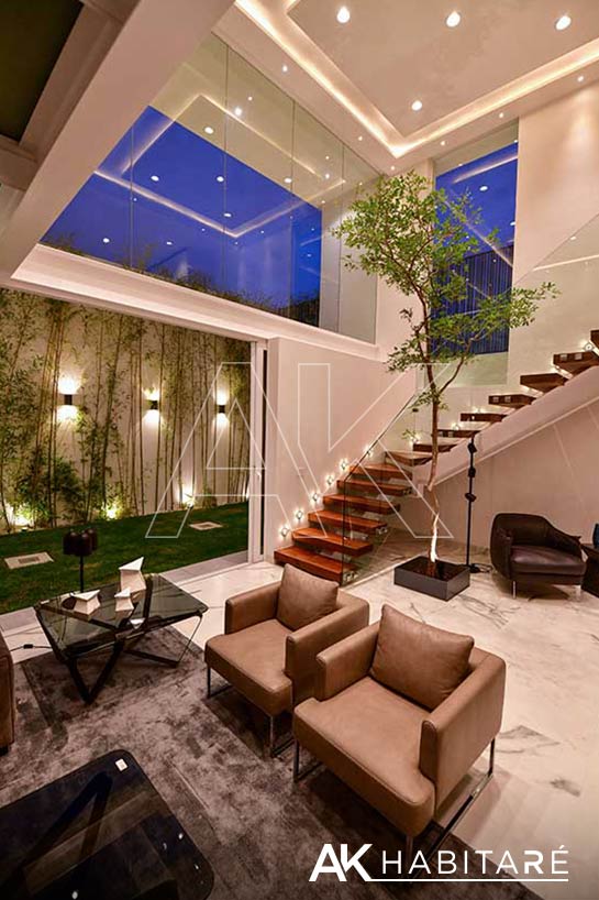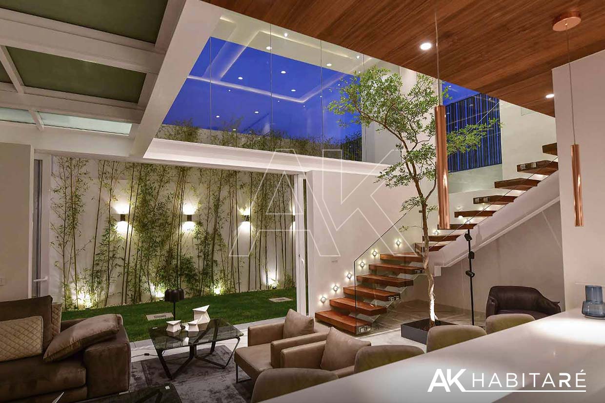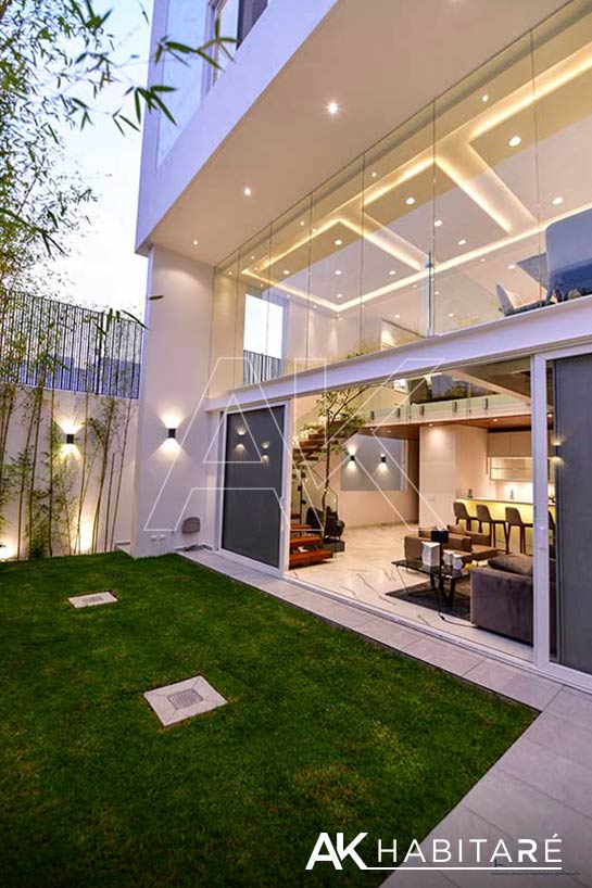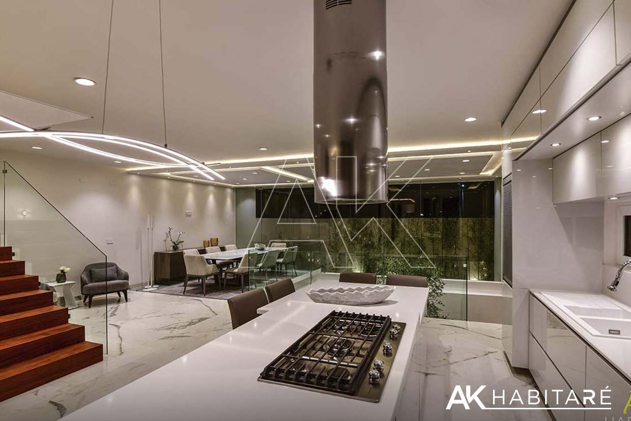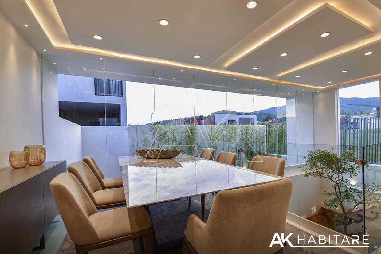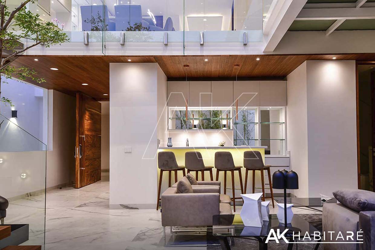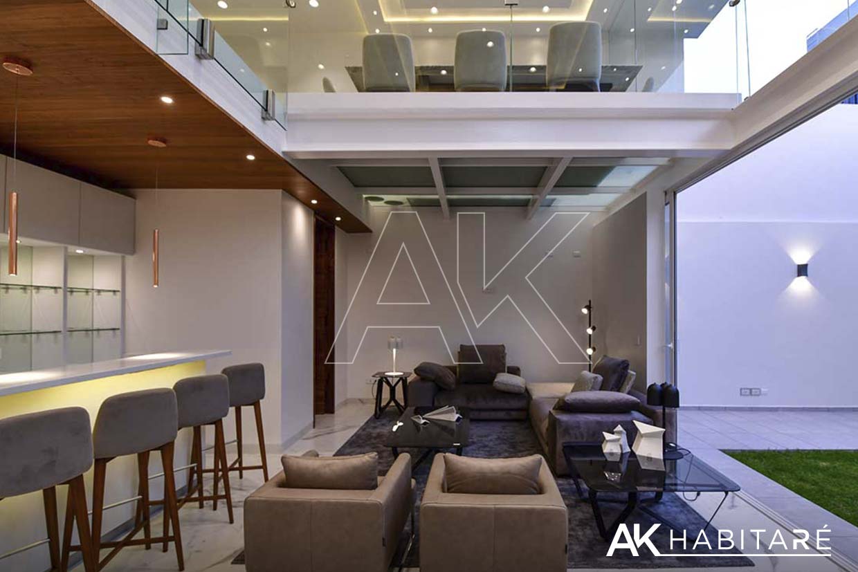 Cochera para 4 autos, cuarto de servicio, bodega, 1/2 baño, bar equipado con refrigerador y contra barra, Área de recibidor con un sofá y clóset multiusos, una sala muy amplia con doble altura, impresionante.